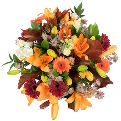 Introduce a symphony of colors into your life with our majestic bloom arrangement. This bouquet features a stunning mix of yellows, oranges, greens, and hints of soothing blue, combining to create an unforgettable floral experience. Each element is hand-selected to ensure freshness and lasting beauty.