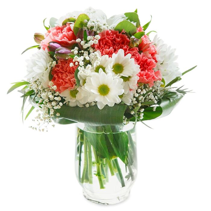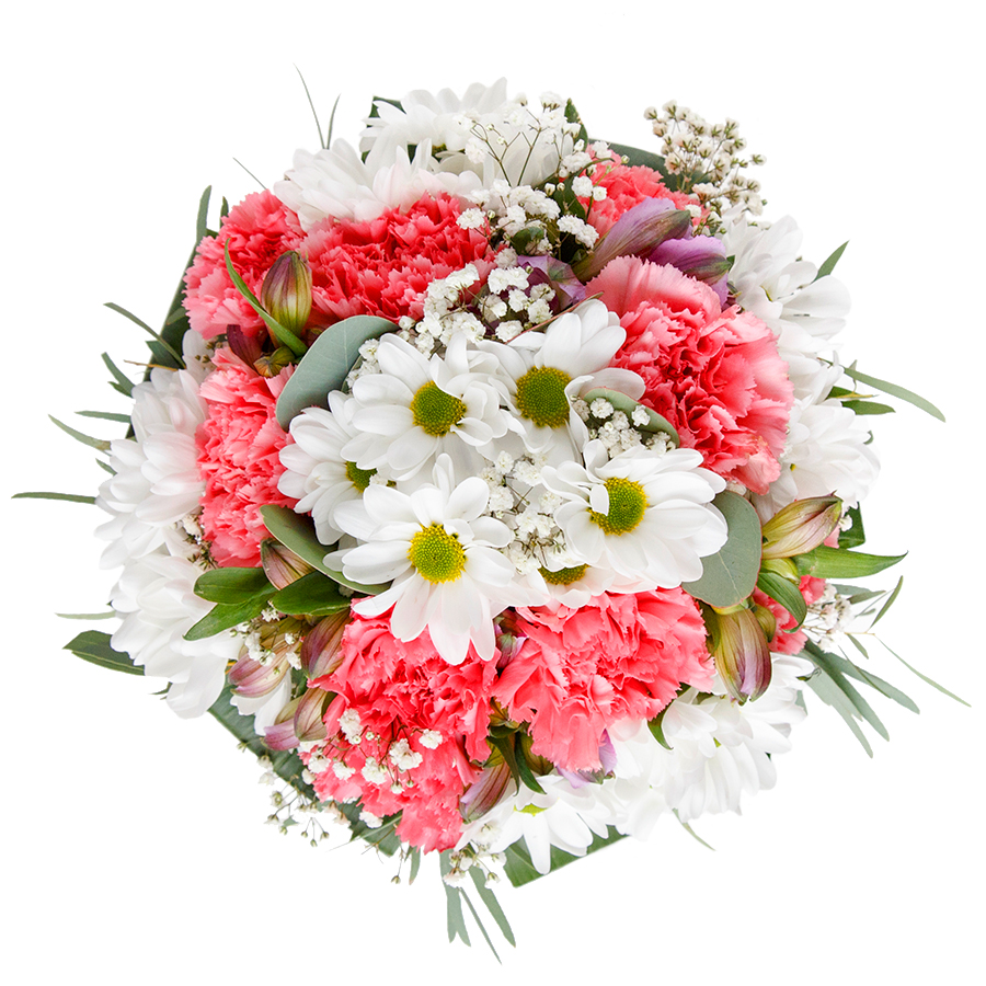 Step into a world of floral artistry with our beautifully curated seasonal bouquet. The gentle blend of snowy white chrysanthemums, airy gypsophila, and blush pink carnations highlights a harmonious color palette, accented by rich aspidistra leaves. Our flowers, carefully selected by experts, ensure that only the freshest blooms grace your gift, maintaining their glow for 5 days.